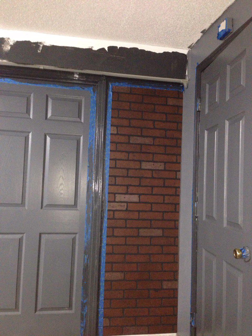 The walls are red brick with black grout. Doors are dark grey, side walls are light grey and the trim is grey-black. We were going to do hard wood flooring, but it exceeded our budget. We are still considering a nice oriental rug instead.